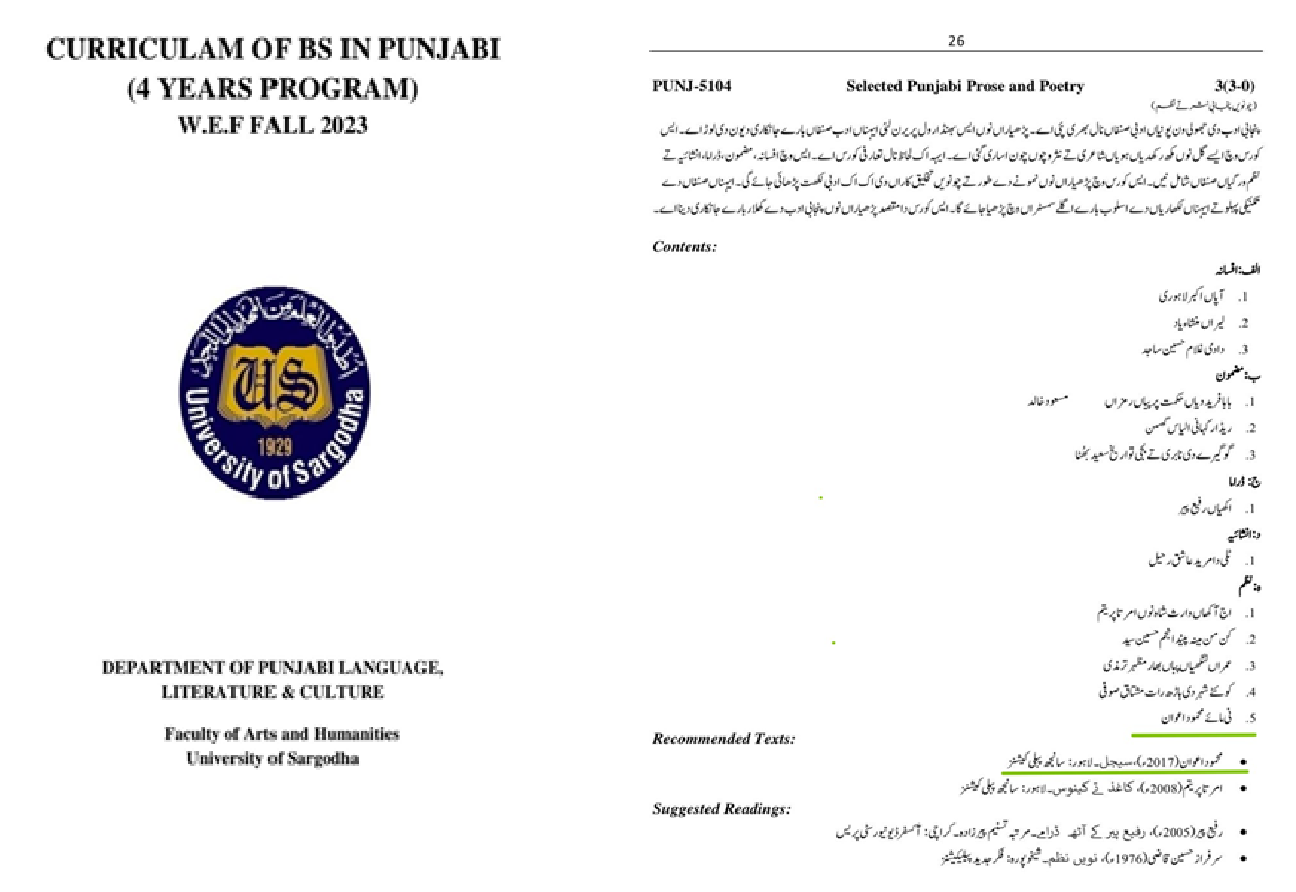 An M.Phil (Post-Graduate; Pre-PhD) degree was awarded for Mahmood Awan’s poetry and literary contributions under a research dissertation titled: “Mahmood Awan di Punjabi Adab nu dain (Mahmood Awan’s contributions to the Punjabi Literature)” by University of the Punjab; Institute of Punjabi and Cultural Studies (Lahore, Pakistan) in 2023. While Awan’s poem Ni Maa’ay ( O’ Mother) is part of the B.SC Punjabi syllabus at two prestigious Universities of Pakistan; Course Code: 2203 at Govt. College University (GC) Lahore & Course Code: PUNJ-5104 at University of Sargodha.